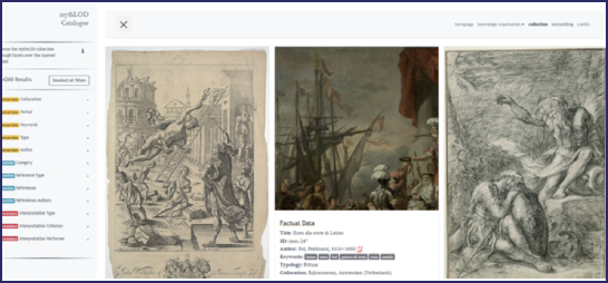 mythLOD catalogue21 (Fig. 1), presents a complete overview of the artworks, which can be browsed through facet filters as their metadata, related references and scholars’ interpretations. In particular, the facets contain some selected information from the first three layers22 of the data model: cultural objects are then browsable via a set of factual metadata (e.g. collocation, period, keywords, type and author), scholars’ interpretations (assertions) addressing the cultural object’s representation (e.g. category) and the literary sources associated with the artworks (e.g. the reference itself, its type and author), and, finally, the interpretations’ contextual metadata (e.g. interpretation type, criterion and author). Facets are organised to express the layered approach adopted by the mythLOD data model. This design aims to provide users with a comprehensive browsing interface that highlights scholars’ perspectives (referred to as capta23) on the Mythologiae data, while hiding technicalities and complexities (e.g., the FRBRoo event-centric approach).