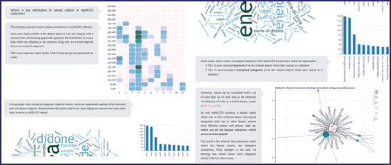 In addition to the four categories of interest, a textual introduction and tips for each visualisation have been added to guide the user through the four sections. In particular, each tip reports the competency question to which the visualisation is answering and a brief explanation of the results. For instance, the network visualisation in the “WHAT” section addresses the question: “Which literary references co-occur with Aeneid?”. The visualisation is also accompanied by a brief explanation noting that four literary sources (namely, Francesco Petrarch’s “Trionfi”, Giuseppe Ungaretti’s “Vita di un Uomo”, Dante Alighieri’s “Divina Commedia”, and Giacomo Leopardi’s “Canti”) exhibit the highest degree of co-occurrence.