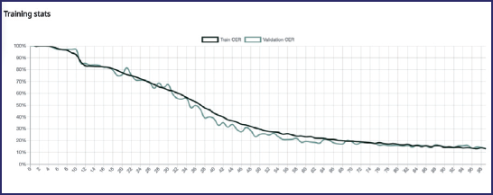 Terminato l’addestramento, il software ha prodotto un modello con CER del 13.40%. Nello specifico, il modello presenta un CER del 13% sul training set e di 13.8% sul validation set.