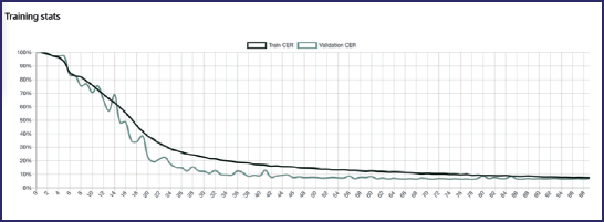 Definita la nuova ground truth, è stato allenato il modello con il motore PyLaia. Per il training set sono state selezionate le 24 pagine del documento contenenti le ground truth, il validation set è stato creato automaticamente sul 10% delle carte del training. È stato poi avviato il lavoro e, terminato l’allenamento, il software ha prodotto un modello con CER del 6.9%; in particolare il train CER è del 7.4%, il validation CER è del 6.9%: