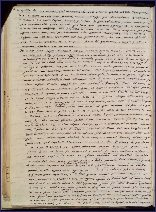 Questo strumento è stato applicato per ottenere le trascrizioni del materiale del Panegirico di Plinio a Trajano contenuto in Alfieri 6, il manoscritto conservato presso la Biblioteca Medicea Laurenziana di Firenze (Fondo Alfieri, [Cat. Sala Studio 6]6). Trattasi della più antica attestazione del testo a noi giunta: l’opera fu ideata e stesa da Vittorio Alfieri7 a Pisa tra l’inverno e l’estate del 1785, poi rivista durante il soggiorno a Martinsbourg, nel 1786, quindi stampata una prima volta a Parigi nell’aprile del 1787 per i tipi di François-Denis Pierres, e nuovamente, dopo un’ulteriore revisione, nell’autunno del 1789, da Didot, questa volta assieme a due altre opere, l’ode Parigi sbastigliato e la favoletta Le mosche e l’Api. Alfieri 6 ospita – oltre al Panegirico alle cc. 29r-38r – i materiali relativi alla Tirannide, recante ancora il titolo Del Tiranno e Della Tirannide (cc. 3r-26r); il dialogo La Virtù Sconosciuta (cc. 41r-50r); il trattato Del Principe e Delle Lettere (cc. 51r-89r); le Prose diverse pel Misogallo. Prose cinque (cc. 91r-112r). L’opera nasce, secondo quanto narrato nell’autobiografia8, dalla lettura del panegirico che Plinio il Giovane recitò all’imperatore Traiano in senato nel 100 d.C.; e si configura come un’orazione il cui nucleo centrale ruota attorno alla richiesta di Plinio rivolta a Traiano di deporre volontariamente il potere assoluto e ristabilire la libertà repubblicana a Roma.
