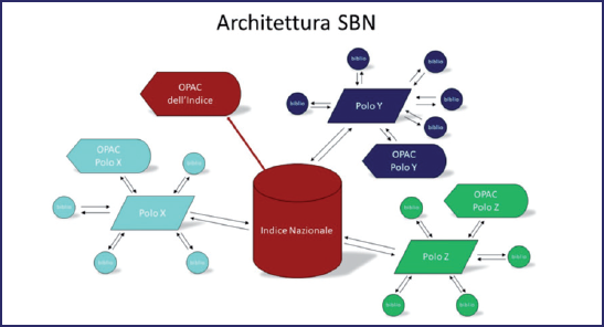 - SBN è la più importante infrastruttura culturale italiana. Ha una struttura stellare in cui al centro si trova l’Indice SBN, che è collegato ai poli SBN. Questi ultimi, a loro volta, permettono alle biblioteche aderenti a ciascun polo di scambiare con l’Indice le informazioni sulle schede catalografiche e sugli elementi di Authority (Nomi, Soggetti, Luoghi, Marche, Titoli dell’Opera). Per ulteriori approfondimenti: <https://www.iccu.sbn.it/it/SBN/>.