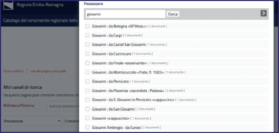 La ricerca, tuttavia, si limita al possessore; non è possibile, ad esempio, effettuare ricerche sui fondi di una biblioteca e vederne i possessori collegati.