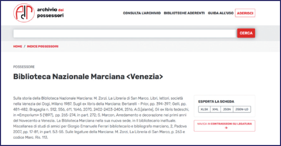 - <https://marciana.venezia.sbn.it/la-biblioteca/cataloghi/archivio-possessori>. Orsola Braides — Elisabetta Sciarra, L’Archivio dei possessori della Biblioteca nazionale Marciana: un database di provenienze, <https://marciana.venezia.sbn.it/sites/default/files/repositoryfile/pagine/2017/allegati/ircdl2016paper13_0.pdf>.