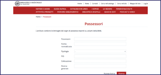 Figura 6. La maschera di ricerca dei possessori messa a disposizione dalla Biblioteca Nazionale Vittorio Emanuele III di Napoli