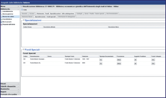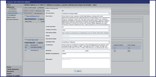 Figura 8. La scheda Fondi speciali nel gestionale dell’Anagrafe delle Biblioteche Italiane