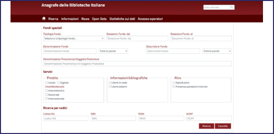 Figura 9. La ricerca avanzata sui Fondi speciali sul sito dell’Anagrafe delle biblioteche italiane